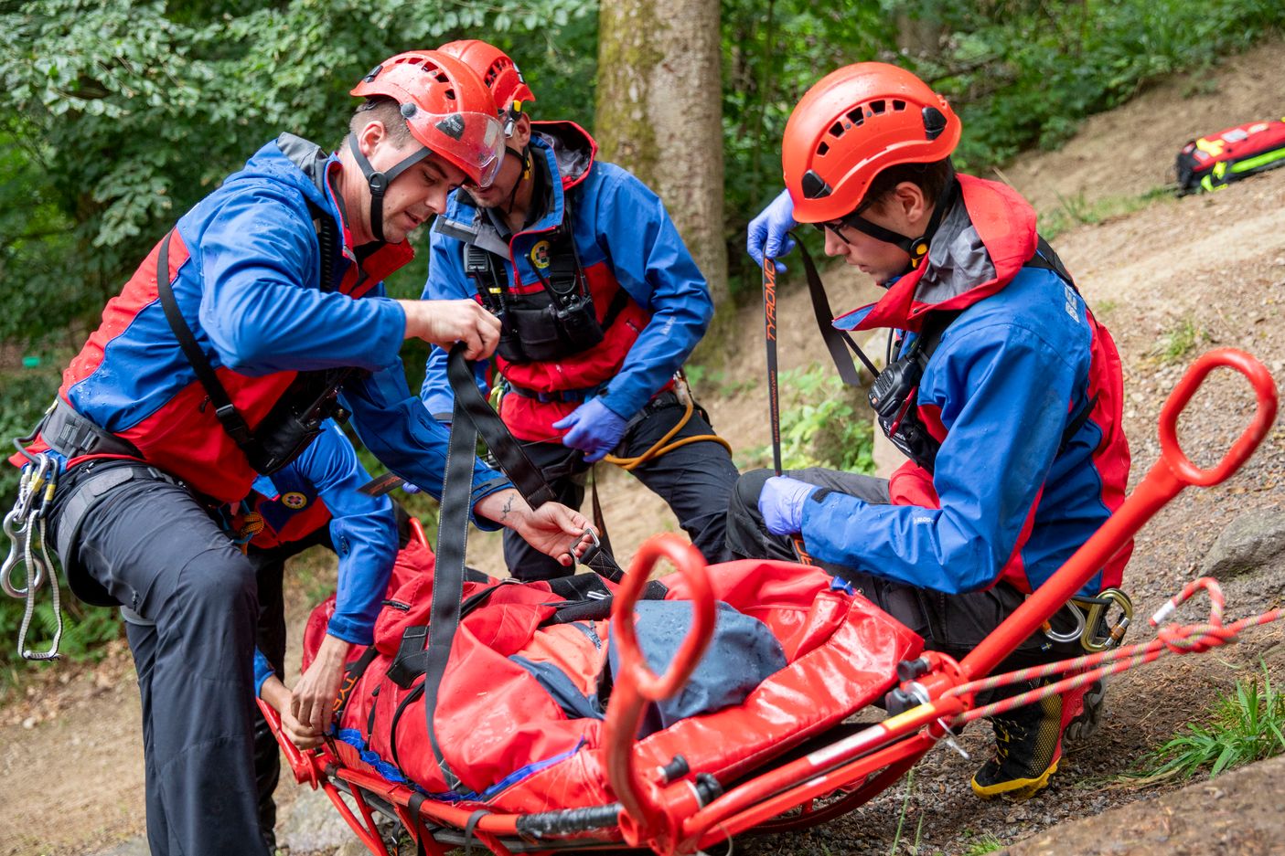 Auch im Albtal bei Albbruck musste die Bergwacht am Sonntagmorgen ihr Können unter Beweis stellen. Ein Kletterer war am Erikafelsen rund acht Meter abgestürzt und anschließend weitere fünf Meter den Hang hinuntergerutscht – mit schweren Verletzungen. Gemeinsam mit der Feuerwehr gelang es den Spezialisten, den Mann per Gebirgstrage durch unwegsames Gelände auf ein Plateau zu bringen. Dort übernahm der Notarzt des Rettungshubschraubers die weitere Versorgung.
