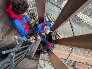 Der Westturm des Münsters ist für Besucher auf mehreren Ebenen zugänglich. Von der Glockenstuhlbasis auf 30 Metern über die Türmerstube auf 43 Metern und die Plattform auf 55 Metern bis hin zur Galerie in 70 Metern Höhe führt der Weg steil nach oben. Für die Einsatzkräfte bedeutet das: Jeder Einsatz ist anders.