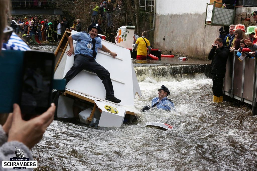 Doch genau das macht den Reiz des Events aus. Mit jedem Wellenritt geht es darum, ob der Zuber trocken bleibt – und wenn nicht, gibt’s den typischen Narrenruf „Batsch – Nass“. Wer es hingegen trocken unterwegs ist, ruft „Furz – Trocka“. In der Regel schreit das erste die Zuberbesatzung, das zweite die Zuschauer und wenn es mal andersrum ist, ist es auch egal. Ja, und wenn die Schiltach richtig viel Wasser hat, hört ihr bestimmt auch den Ruf „Kanal – voll“. Immer laut schreien.