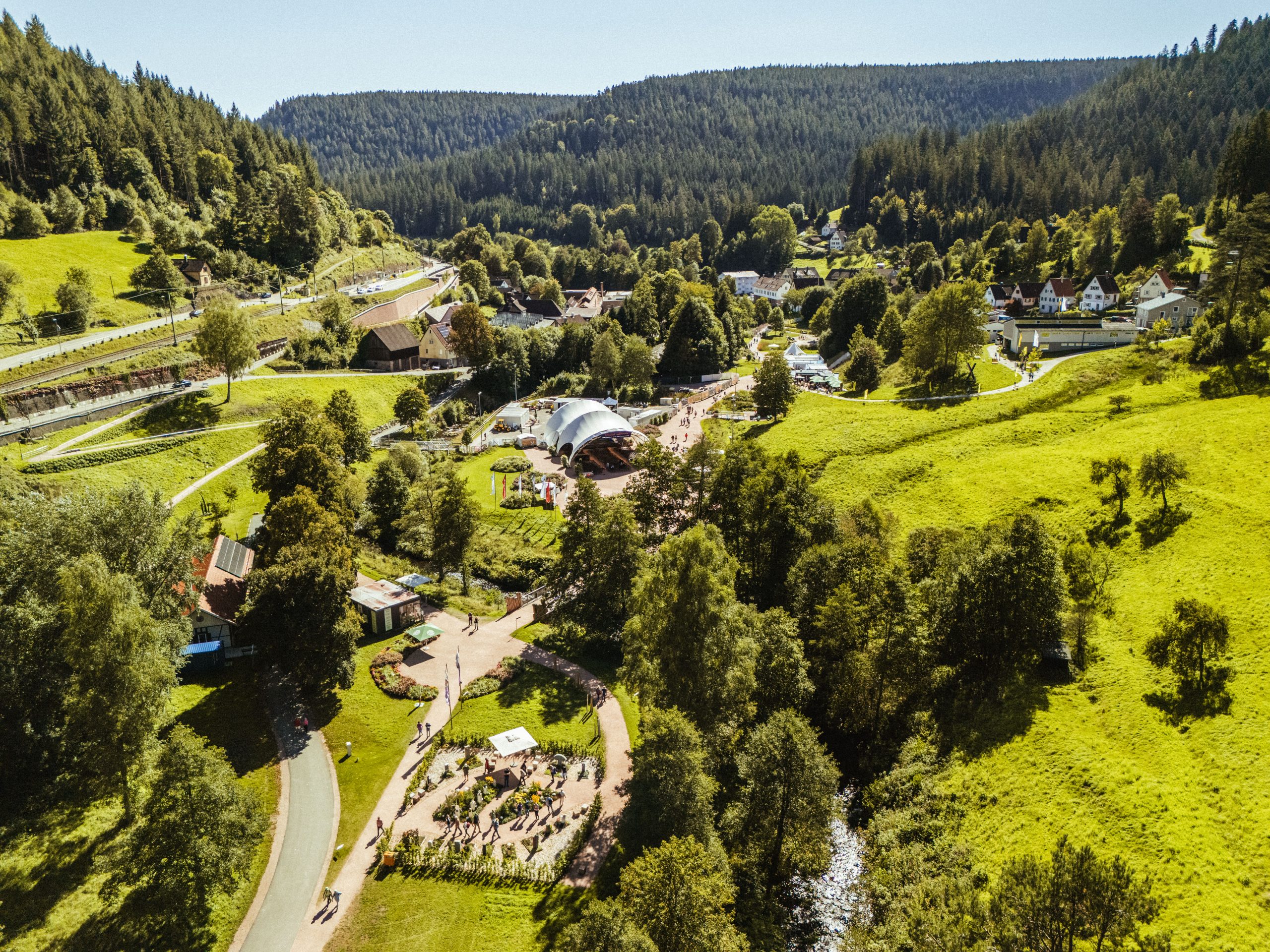 Das Xentrum im Tal X von oben – die Gartenschau eingebettet in die typische Landschaft des Nordschwarzwaldes.