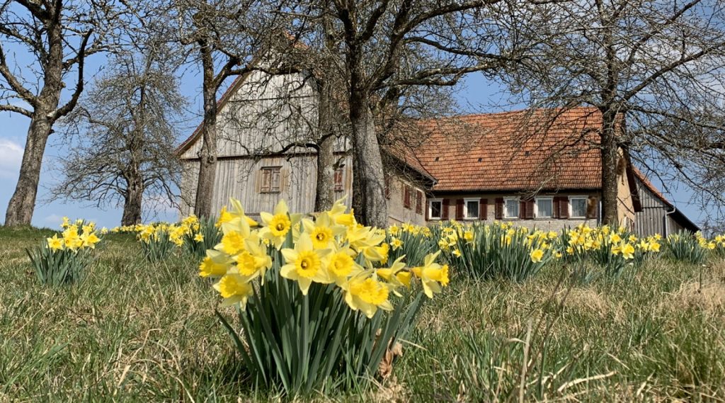 Prächtig leuchten wilde Narzissen auf einer Wiese vor einem alten Bauernhaus in Gaugenwald. © Gemeinde Neuweiler · Martin Buchwald · CC BY-SA